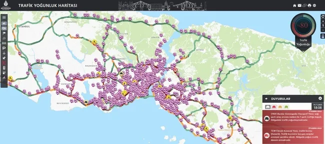 İBB CepTrafik uygulaması verilerine göre, kent genelindeki trafik yoğunluğu saat 18.00 itibariyle yüzde 80'e ulaştı.