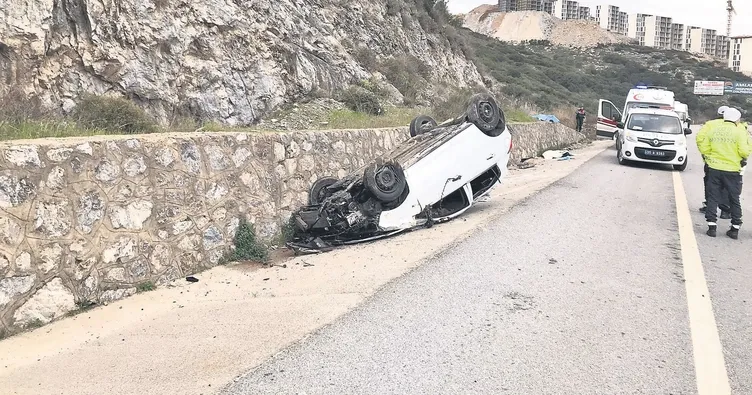 İzmir'in Selçuk ilçesinde dün saat 07.30 sıralarında sürücüsü henüz belirlenemeyen otomobil, seyir halindeyken kontrolden çıkıp istinat duvarına çarptı. Çarpmanın etkisiyle otomobil taklalar attı.