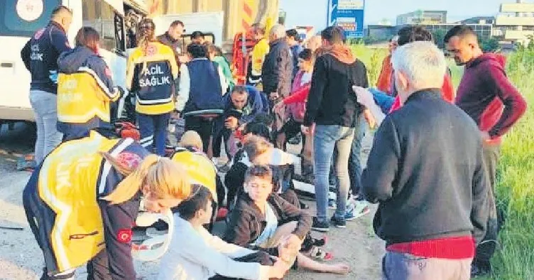 Kocaeli'nin Gebze ilçesinde, İsmail T.'nin kullandığı işçi servisi, dün sabah saat 07.00 sıralarında, D-100 Karayolu Kuzey Marmara Otoyolu ayrımında, önünde giden TIR'a çarptı. Çarpışmanın etkisiyle kontrolden çıkarak devrilen serviste, 3'ü ağır 13 işçi yaralandı. Eskişehir'de Ahmet Sadık Beldek idaresindeki TIR, Kanlıpınar mevkiinde, yol kenarında duraklayan Kusay K.'nın kullandığı araca çarptı. Kazada Suriye uyruklu Kusay K. hayatını kaybetti.