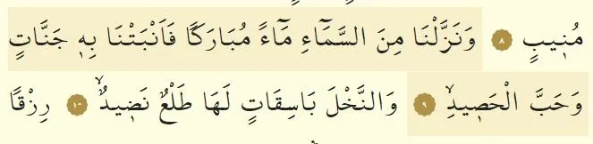 Ve nezzelnâ mine-ssemâ-i mâen mubâraken fe-enbetnâ bihi cennâtin ve habbe-lhasîd(i)
