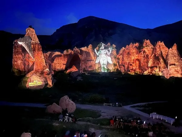 Görsel şölende Kapadokya'nın jeolojik oluşumu, sonrasında da Asur Ticaret Kolonileri, Hititler, Frig, Pers, Roma, Bizans, Selçuklu, Osmanlı ve Cumhuriyet dönemine ait yaşanmış tüm medeniyetlerin tarihi süreci, 3D Mapping teknolojisiyle peribacalarına yansıtılarak anlatıldı.