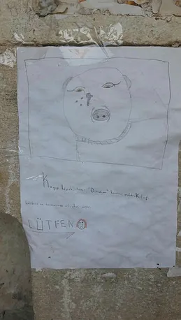Hazırladıkları el ilanına köpeğinin bir de resmini çizen minik hayvan severler "Kayıp köpek ismi Dımdım. Kendisi yaşlıdır. Kulağı kesiktir ve tasmasında dikenleri vardır" deyip, ilanın altına da büyük harflerle 'lütfen' yazdılar.