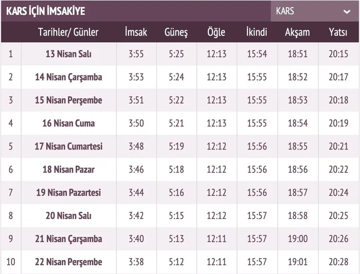 Kars Ramazan imsakiyesi ile iftar vakti ve sahur saatleri bilgilerini öğrenebilirsiniz. Diyanet'ten yayınlanan verileri göre Kars iftar saati ve sahur vakti şöyle;