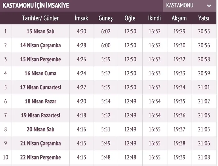 Ramazan ayı bu yıl 13 Nisan Salı günü başlıyor. On bir ayın sultanı yine aynı coşku ve sevinç ile karşılanırken, il il imsakiye de yayınlandı. Diyanet İşleri Başkanlığı'nın resmi internet sitesinden yayınlanan Ramazan İmsakiyesi ile Kastamonu'da iftar vakti ve sahur saatleri belli oldu. Kastamonu'da sahur vakti ve iftar vakti saat kaçta sorusu cevabını bulmuş oldu. 2021 Kastamonu Ramazan İmsakiyesi ile Kastamonu iftar saati, sahur vakti ve imsak vakti bilgileri sabah.com.tr'nin imsakiye sayfası üzerinden öğrenebilirsiniz.