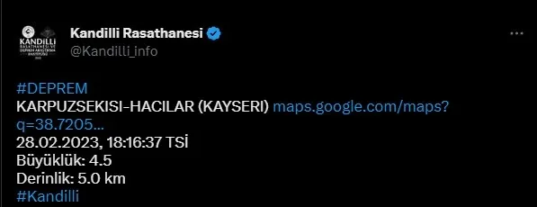 Boğaziçi Üniversitesi Kandilli Rasathanesi ve Afet ve Acil Durum Yönetimi Başkanlığı (AFAD)'ın sürekli olarak güncellediği ve kamuoyuna duyurdu son depremler listesine göre Kayseri'de saat 18:16'da 4.4 şiddetinde bir son dakika depremi meydana geldi. Yerin 7 kilometre derinliğinde meydana gelen deprem merkez üssüne yakın illerimizde de hissedildi. Sarsıntıların ardından çevre il ve ilçelerde yaşayan vatandaşlar da panik yaşadı.