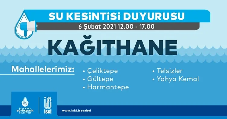 İstanbul Büyükşehir Belediyesi iştiraki İstanbul Şu ve Kanalizasyon İdaresi Cumartesi günü Kağıthane'nin belirli mahallelerine su verilmeyeceğini açıkladı.