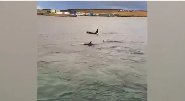 Katil balina, izleyenlerin korku dolu bakışları altında yalnızca birkaç metre uzaklıkta yüzüyor. Viking Fitness Training'in kurucusu Haydn, bu görkemli hayvanların Shetland'da yaygın bir manzara olmasına rağmen katil balinaları bu kadar yakından ilk kez gördüğünü belirtti.