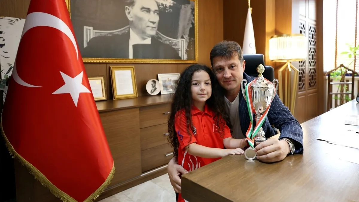 Ziyaretten büyük bir mutluluk duyduğunu ifade eden Belediye Başkanı Vahap Akay, "Kumsal, Ocak ayında Antalya'da düzenlenen Türkiye Şampiyonası'nda 3'üncü olarak göğsümüzü kabartmıştı. Şimdi de Milli forma ile ülkemizi İrlanda'da düzenlenen Avrupa Şampiyonası'nda başarıyla temsil etti. Bizleri bu başarısıyla bir kez daha gururlandırdı. İnşallah Dünya Şampiyonası'na da katılacak ve daha büyük başarılara imza atacak" dedi ve minik Kumsal'a eğitim ve spor hayatında başarılar diledi.