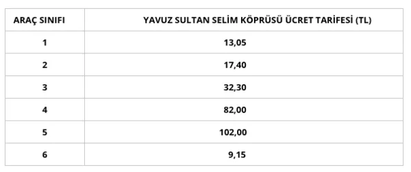 2018 YAVUZ SULTAN SELİM KÖPRÜSÜ ÜCRETLERİ