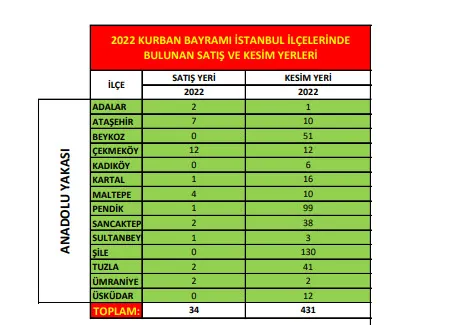 Kurban Bayramı yaklaşırken bayram öncesi ve sonrasında herhangi bir olumsuzluk yaşanmaması için gerekli önlemler alınırken, kesim ve satış yerlerinde temizlik ve bakım çalışmaları da beraberinde yürütülüyor. İstanbul kurban kesim yerleri ve kurban satış alanları aşağıdaki gibidir;