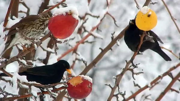 Ertesi gün de bıraktım uçtular. Tipi en fazla 1- 2 gün sürüyor zaten. Kuşların açlığını nasıl telafi edebilirim diye düşündüm. Doğaya ve kuşlara nasıl yardımcı olabilirim diye düşündüm. Bulduğum çözüm doğal olması lazım dedim. Kışın böyle renkli elmalar kuşları çok dikkatini çeker. Böcek yiyen kuş olsun, yem yiyen kuş olsun her biri bu elmaları görür.