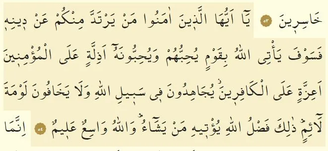 "Ey iman edenler! Sizden kim dininden dönerse bilsin ki Allah öyle bir kavim getirecektir ki Allah onları sever, onlar da Allah'ı severler; müminlere karşı alçak gönüllü, kâfirlere karşı vakarlıdırlar; Allah yolunda cihad ederler ve hiç kimsenin kınamasından korkmazlar. İşte bu Allah'ın dilediğine verdiği bir lütfudur. Allah'ın lütfu geniştir; O, her şeyi bilir."