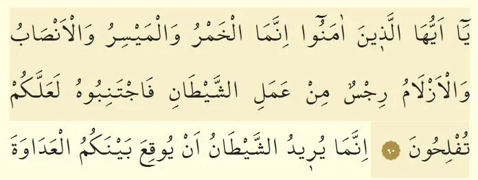 Ya eyyuhellezine amenu innemel hamru vel meysiru vel ensabu vel ezlamu ricsun min ameliş şeytani fectenibuhu leallekum tuflihun.