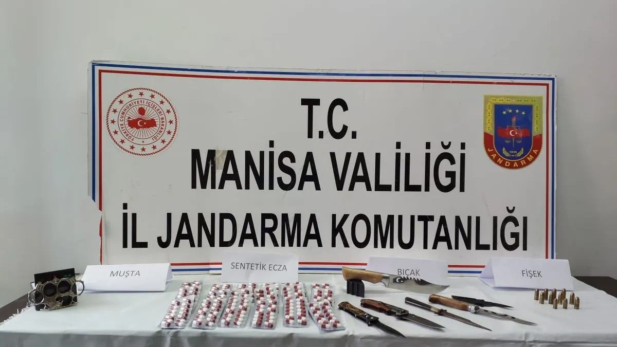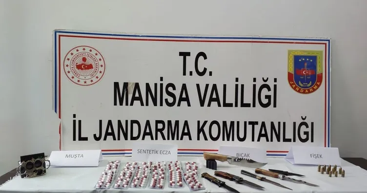 Manisa İl Jandarma Komutanlığı KOM Şube Müdürlüğü, 26 Mayıs Pazar günü uyuşturucu madde imal ve ticareti yapan şahıslara yönelik gerçekleştirdiği operasyonda, 452 gram esrar, 367 adet sentetik ecza hapı, 192 adet extacy, 8 gram metamfetamin, 70 gram skunk maddesi, 14 kök kenevir bitkisi, 13 gram kenevir tohumu, 6 adet aparat, 6 adet bıçak, 1 adet muşta, 11 adet 9 mm. fişek ve suçtan elde edildiği değerlendirilen 58 bin 350 TL ele geçirdi.