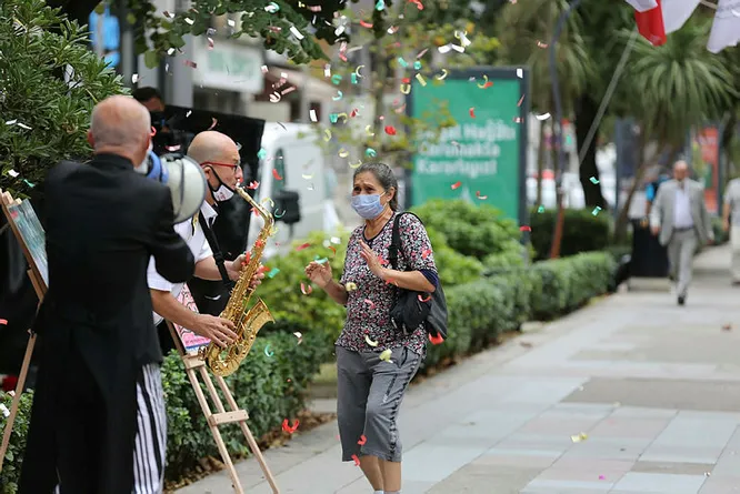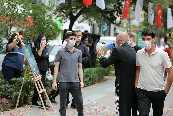 Karşısında tiyatro oyuncusu ve bandoyu gören vatandaşlar şaşkınlıklarını gizleyemedi. Elindeki megafon ile vatandaşlara sağlığı için maskesini doğru bir şekilde taktığı için teşekkür eden tiyatro oyuncuları, maske kullanımını doğru bir şekilde yapan vatandaşlara Şehir Tiyatrolarının 2 kişilik oyun davetiyesini ve maske hediye etti. Kocaeli Şehir Tiyatroları Genel Sanat Yönetmeni Aydın Sigalı da sosyal deneyi yakından takip etti.