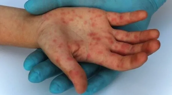 - Deri döküntüsü genellikle ateşin ortaya çıkmasından sonraki 1-3 gün içinde başlar. Döküntü, gövdeden ziyade yüz ve ekstremitelerde daha konsantre olma eğilimindedir. Döküntüler genelde yüzde başlayıp (vakaların %95'inde) ve avuç içlerini ve ayak tabanlarını (vakaların %75'inde) etkiler. Ayrıca oral mukozalar (vakaların %70'inde), genital bölge (%30) ve konjonktiva ile birlikte kornea da (%20) etkilenir. Döküntü, ardışık olarak maküllerden (düz tabanlı lezyonlar) papüllere (hafifçe kabarık sert lezyonlar), veziküllere (berrak sıvı ile dolu lezyonlar), püstüllere (sarımsı sıvı ile dolu lezyonlar) ve kuruyup dökülen kabuklara doğru değişiklik gösterir.