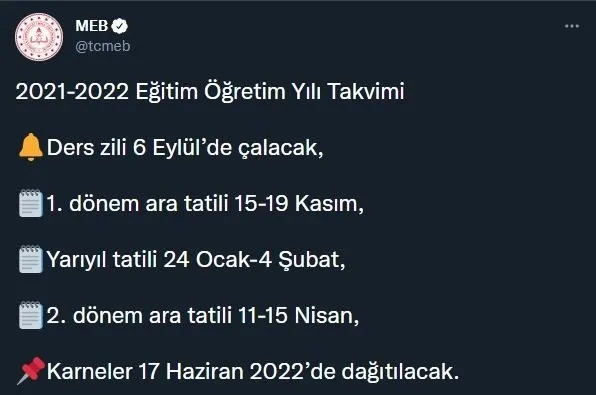 6 Eylül Pazartesi günü başlayan birinci dönem için eğitim 21 Ocak Cuma günü sonlanacak. Öğrenciler ilk dönem karnelerini aldıktan sonra 4 Şubat'a kadar sömestr tatilinde olacak.