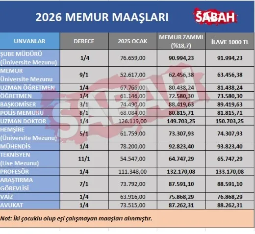 2026 Ocak'ta memur maaşları, toplu sözleşme zammı ile enflasyon farkının birleşmesiyle belirlenecek. TÜİK'in son 6 aylık dikkate alındığında, memurlar için şimdiden %16,56'lık bir artış oranı oluşmuş görünüyor. Polis, öğretmen, hemşire, doktor gibi tüm kamu görevlilerinin maaşlarına yansıyacak bu artış hesaplanmaya başladı. Peki, Ocak 2026 memur zammı ne kadar olacak? İşte detaylar…