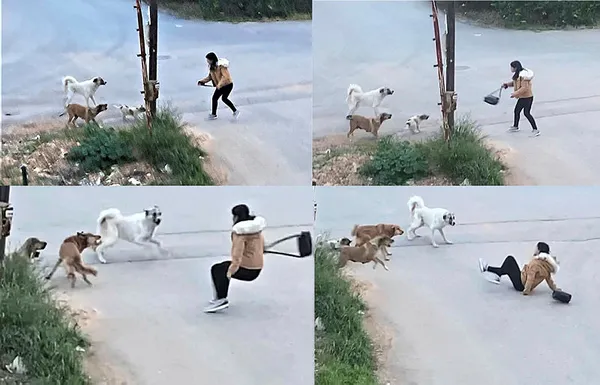 Genç kız köpeklerden çantası sayesinde korundu. Çantasıyla hayvanların saldırmasını önlemeye çalışan genç kız dengesini kaybedip yere düşerken, apartmandan hayvanların sesini duyan bir kişi pet şişe atarak müdahale etmek istedi. Bu sırada araçla bölgeden geçen bir vatandaş korna çalarak hayvanları korkutup kızı kurtardı. O anlar ise bir sitenin güvenlik kamerasına yansıdı.