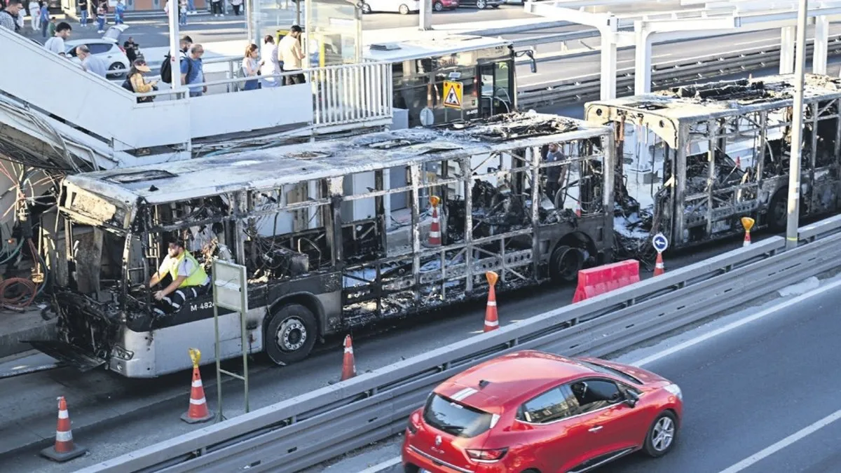 İstanbul'da sık sık yaşanan toplu taşıma sorunlarına dün iki tane daha eklendi. Bakırköy İncirli'de dün saat 18.00 sıralarında Edirne istikametinde seyreden bir metrobüste yangın çıktı. Kısa sürede büyüyen alevler metrobüsün tamamına yayılırken, yolcular hızla tahliye edildi. Olay yerine polis ve itfaiye ekibi sevk edildi. İtfaiye ekiplerinin müdahalesi sırasında zaman zaman patlama sesleri duyuldu. Ekiplerin müdahalesiyle yangın söndürülürken, tamamen yanan araç hurda yığınına döndü. Bölgede korkulu anların yaşandığı yangın sebebiyle metrobüs seferleri durdurulurken, bölgede uzun metrobüs kuyruğu oluştu. İETT'den yapılan açıklamada, yangın çıkan araçtaki yolcular tahliye edilirken yaşanan panik sırasında bir kişinin ayağından yaralandığı belirtildi. Açıklamada olayla ilgili, İETT, İBB ve adli makamlarca teknik ve idari soruşturmanın sürdüğü kaydedildi.