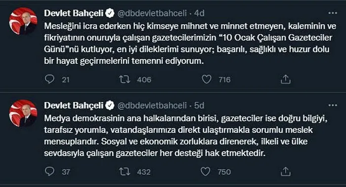 Bahçeli, "10 Ocak Çalışan Gazeteciler Günü" dolayısıyla Twitter hesabından paylaşımda bulundu.
