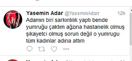 Adar, olaya ilişkin olarak "Adamın biri sarkıntılık yaptı bende yumruğu çaktım ağzına hastanelik olmuş şikayetci olmuş sorun değil o yumruğu tüm kadınlar adına attım" şeklindeki mesajın paylaşıldığı sosyal medya hesabının milli sporcumuza ait olmadığı ortaya çıktı.