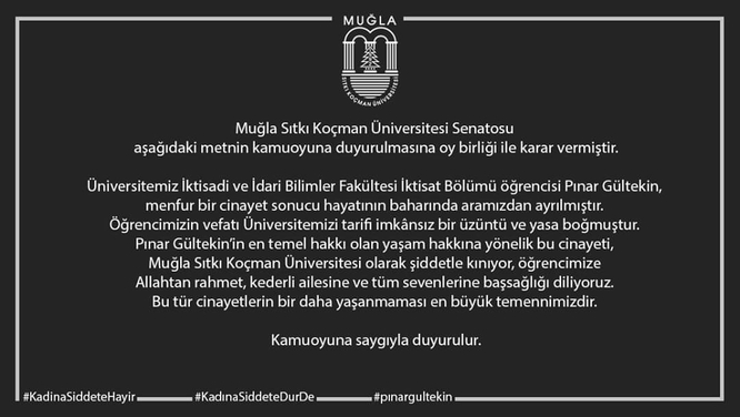 Senato açıklamasında şunları kaydetti: "Üniversitemiz İktisadi ve İdari Bilimler Fakültesi İktisat Bölümü öğrencisi Pınar Gültekin, menfur bir cinayet sonucu hayatının baharında aramızdan ayrılmıştır. Öğrencimizin vefatı üniversitemizi tarifi imkansız bir üzüntü ve yasa boğmuştur. Pınar Gültekin'in en temel hakkı olan yaşam hakkına yönelik bu cinayeti, Muğla Sıtkı Koçman Üniversitesi olarak şiddetle kınıyor, öğrencimize Allah'tan rahmet, kederli ailesine ve tüm sevenlerine başsağlığı diliyoruz. Bu tür cinayetlerin bir daha yaşanmaması en büyük temennimizdir."