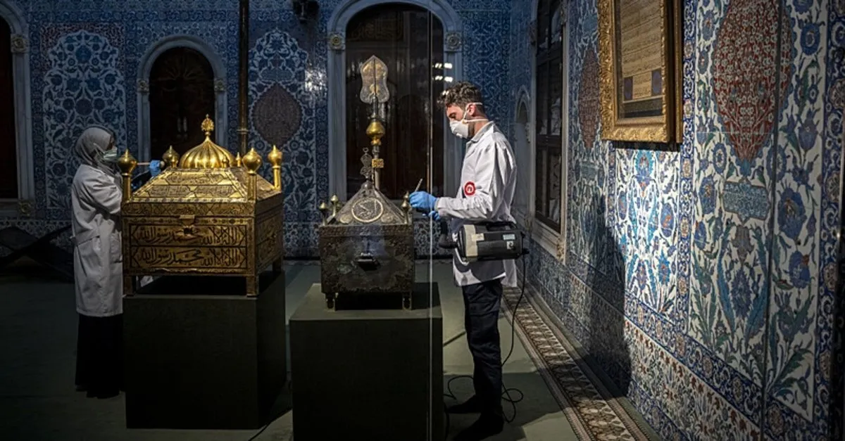 Ramazan ayının yaklaşması sebebiyle Topkapı Sarayı içerisindeki Mukaddes Emanetler Dairesi'nde sergilenen eserlerde detaylı temizlik ve bakım çalışmaları yapıldı. Milli Saraylar Başkanı Dr. Yasin Yıldız, birkaç yıldır kapalı olan Mukaddes Emanetler Dairesi'nin, Başkan Recep Tayyip Erdoğan'ın teşrifiyle geçen yıl yeniden ziyarete açıldığını hatırlattı. Eserler için özel bir vitrin sisteminin yapıldığına dikkati çeken Yıldız, "Bu vitrinleme sistemimiz bizim yaklaşık iki yılımızı aldı. Ama şunu çok rahat söyleyebiliriz. Her türlü iklim şartına, her türlü doğal afete karşı burada yapılmış sergi düzeni ciddi bir müzecilik başarısını içinde barındırıyor" dedi. Geçen yıldan bu yana Mukaddes Emanetler Dairesi'nde sergilenen eser sayısının 60'dan 300'e yükseltildiğini sözlerine ekleyen Yıldız, "Buranın her bölümüyle ayrı ayrı ilgilenen mütehassis ziyaretçilerimiz var" diye konuştu. Mukaddes Emanetler Dairesi'nde Hazreti Muhammed'in Hırkası (Hırka-i Saadet), sakalı, ayak izleri, Uhud Savaşı'nda kırılan dişinin saklandığı mahfaza, mektupları ve kılıcı bulunuyor. Ayrıca Hazreti İbrahim'in tenceresi, Hazreti Musa'nın asası, Hacerü'l Esved mahfazası gibi "Asr-ı Saadet"i yansıtan mukaddes emanetler sergileniyor.
