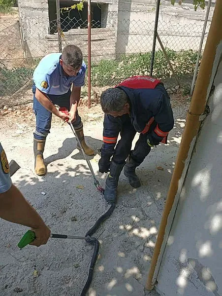 Alınan bilgiye göre, Kargıpınarı Mahallesi'ndeki evlerinin mutfağında yaklaşık 2 metrelik yılan gören ev sahipleri, itfaiyeyi arayıp yardım istedi.