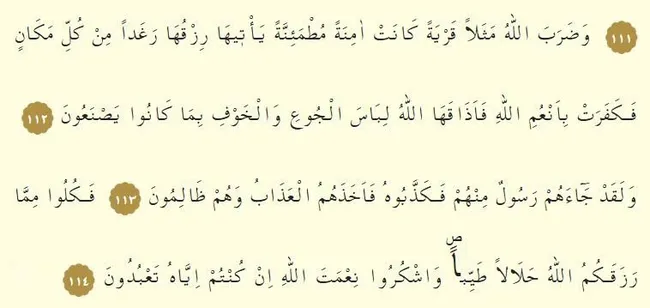 112. Ayet: Allah şöyle bir memleketi misal verdi: Orası güven ve huzur içinde idi. Oraya her taraftan bolca rızık gelirdi. Fakat Allah'ın nimetlerine nankörlük ettiler; bu yüzden yaptıklarına karşılık Allah onlara şiddetli açlık ve korku ızdırabını tattırdı.