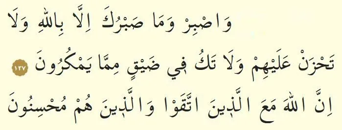 127. Vasbir ve ma sabruke illa billahi ve la tahzen aleyhim ve la tekü fı daykım mimma yemkürum