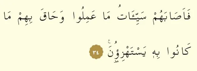 34. Ayet: Bu sebeple işledikleri kötülüklerin cezası onlara ulaştı ve alay ettikleri şey kendilerini kuşattı.