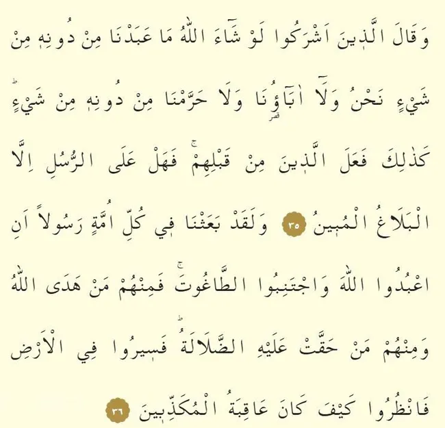 35. Ayet: Ve kalellezıne eşraku lev şaellahü ma abedna min dunihı min şey'in nahnü ve la abaüna ve la harramna min dunihı min şey' kezalike fealellezıne min kablihim fe hel aler rusüli illel belağul mübın