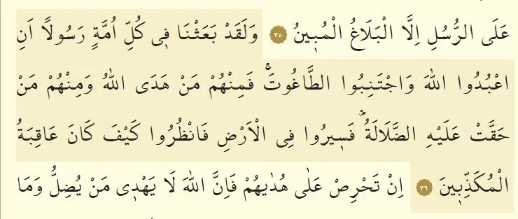 "Andolsun biz, her ümmete, "Allah'a kulluk edin, tâğûttan kaçının" diye peygamber gönderdik. Allah, onlardan kimini doğru yola iletti; onlardan kimine de (kendi iradeleri sebebiyle) sapıklık hak oldu. Şimdi yeryüzünde dolaşın da peygamberleri yalanlayanların sonunun ne olduğunu görün."