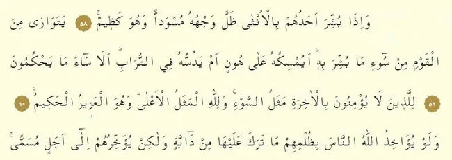 58. Ayet: Onlardan biri, kız ile müjdelendiği zaman içi öfke ile dolarak yüzü simsiyah kesilir!