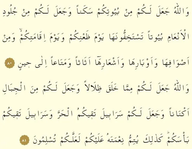 80. Ayet: Allah, size evlerinizi huzur ve dinlenme yeri yaptı. Hayvanların derilerinden gerek göç gününüzde gerek ikamet gününüzde kolayca taşıyacağınız evler; onların yünlerinden, yapağılarından ve kıllarından bir süreye kadar yararlanacağınız ev eşyası ve geçimlikler meydana getirdi.