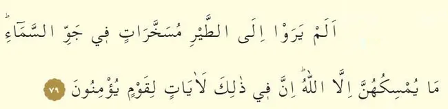 79. Ayet: Gökyüzünde Allah'ın emrine boyun eğerek uçan kuşları görmüyorlar mı? Onları gökte ancak Allah tutar. Şüphesiz bunda inanan bir toplum için ibretler vardır.