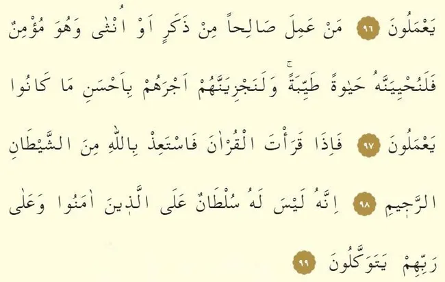 97. Ayet: Men amile saliham min zekerin ev ünsa ve hüve mü'minün fe le nuhyiyennehu hayaten tayyibeh ve la necziyennehüm ecrahüm bi ahseni ma kanu ya'melun