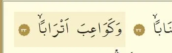 "Şüphesiz Allah'a karşı gelmekten sakınanlara bir kurtuluş, bahçeler, üzümler, kendileriyle bir yaşta, göğüsleri çıkmış genç kızlar ve dolu dolu kadehler vardır."