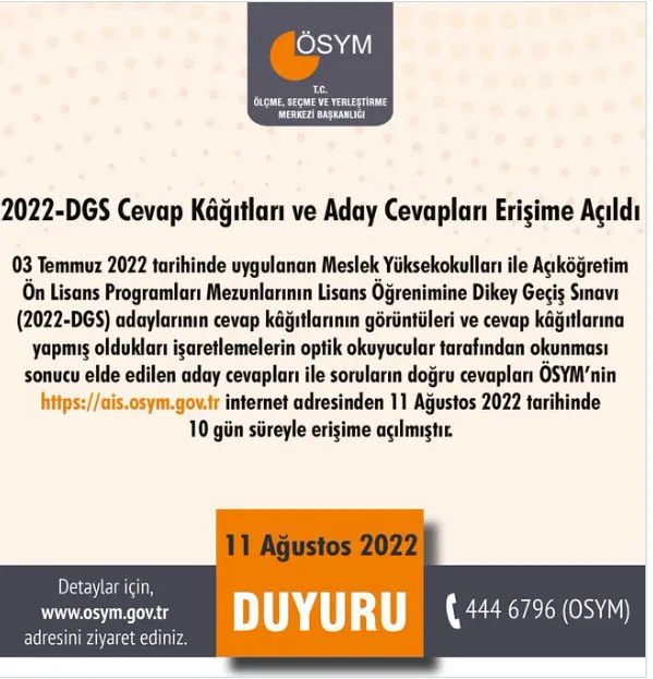 03 Temmuz 2022 tarihinde uygulanan Meslek Yüksekokulları ile Açıköğretim Ön Lisans Programları Mezunlarının Lisans Öğrenimine Dikey Geçiş Sınavı (2022-DGS) adaylarının cevap kâğıtlarının görüntüleri ve cevap kâğıtlarına yapmış oldukları işaretlemelerin optik okuyucular tarafından okunması sonucu elde edilen aday cevapları ile soruların doğru cevapları ÖSYM'nin https://ais.osym.gov.tr adresinden 11 Ağustos 2022 tarihinde saat 12.45'ten itibaren 10 gün süreyle erişime açılmıştır.