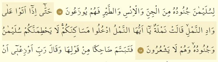 Nihayet karınca vadisine geldikleri vakit bir karınca, "Ey karıncalar! Yuvalarınıza girin, Süleyman ve ordusu farkına varmadan sizi ezmesinler" dedi.