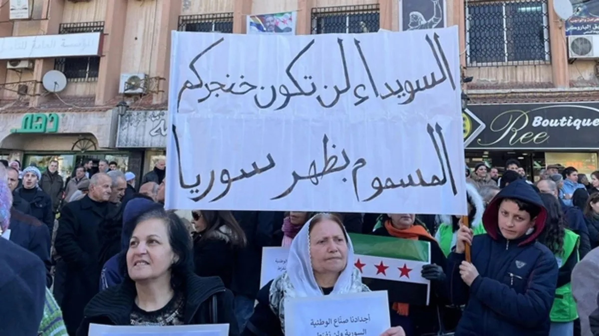 Ellerinde "Suriye bayrağı", "Hiçbir işgal, zaman geçse bile meşru değildir", "İsrail'e hayır, nesilden nesile biz özgürüz" ve "Her türlü işgale hayır" yazılı dövizler taşıyan göstericiler, "Suriye, Suriyelilerindir" sloganları attı.