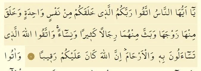 Ey insanlar! Sizi bir tek nefisten yaratan ve ondan da eşini yaratan; ikisinden birçok erkek ve kadın (meydana getirip) yayan Rabbinize karşı gelmekten sakının. Kendisi adına birbirinizden dilekte bulunduğunuz Allah'a karşı gelmekten ve akrabalık bağlarını koparmaktan sakının. Şüphesiz Allah üzerinizde bir gözetleyicidir.