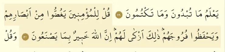 Kul lilmu/minîne yaġuddû min ebsârihim veyahfezû furûcehum(c) żâlike ezkâ lehum(k) inna(A)llâhe ḣabîrun bimâ yasne'ûn(e)