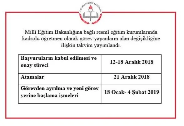MEB, Bakanlığa bağlı okullarda kadrolu olarak görev yapan öğretmenlerin alan değişikliğine ilişkin takvimi yayımladı. Milli Eğitim Bakanlığının hazırlamış olduğu takvime göre başvurular 12-18 Aralık 2018 tarihleri arasında alınacak.