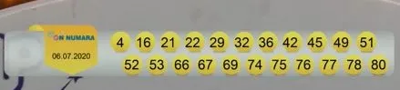 6 Temmuz On Numara sonuçları: 45 - 78 - 42 - 74 - 16 - 69 - 53 - 21 - 75 - 22 - 49 - 76 - 66 - 80 - 52 - 32 - 4 - 77 - 36 - 51 - 29 - 67
