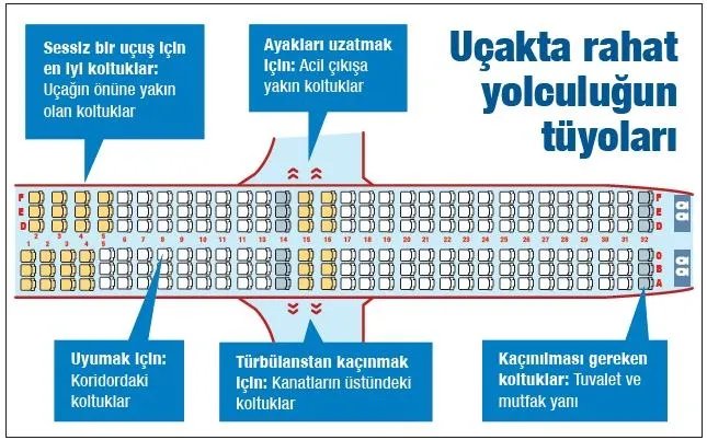 Uçuş sırasında çok sayıda yolcunun şikâyetçi olduğu türbülans ya da bacak ağrılarından kaçınmak aslında mümkün. Avustralya'da yayımlanan news.com. au isimli haber sitesi rahat bir uçuş için önemli tüyolar verdi. Habere göre rahat bir yolculuğun sırrı koltuk seçimine bağlı. İngiliz pilot Jonny Knowlson, türbülanstan korkan yolculara kanatların üzerindeki koltuklarda oturmalarını öneriyor. Gece boyunca uyumak isteyen yolcular içinse Jonny Knowlson'un önerisi şu şekilde: "En sessiz koltuk motordan olabildiğince uzak olandır. Ön sıradaki koltukları kaçırdıysanız koridor bölümünden bir koltuk alın." Pilot, ayrıca sessizlik için tuvalet ve mutfak bölümünden de uzak durulması gerektiğini vurguluyor. "Dreamliner (Boeing-787) ile uçuyorsanız, 30'uncu sıradaki herhangi bir koltuğun ayakları uzatmak için daha çok alanı bulunuyor. 12 ile 13'üncü sıradaki koltukların ise bunun için çok daha az bölümü var" diyen Jonny, ayaklarını uzatmak isteyen yolcular için Airbus A319 uçaklarında 10'uncu sıradaki B, C, D ve E koltuklarının acil çıkış bölümü nedeniyle geniş bir alanı olduğunu hatırlatıyor.