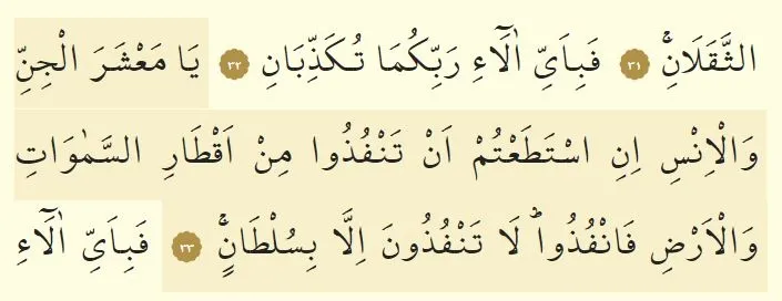 "Yâ ma'şera-lcinni vel-insi ini-steta'tum en tenfużû min aktâri-ssemâvâti vel-ardi fenfużû(c) lâ tenfużûne illâ bisultân(in)"