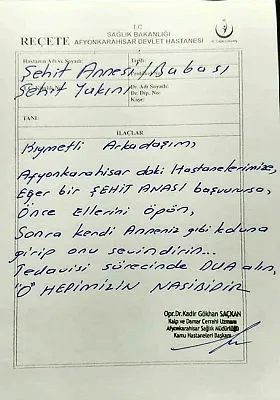 Afyon Kamu Hastaneleri Başkanı ve Afyonkarahisar Devlet Hastanesi kalp ve damar cerrahi uzmanı Op. Dr. Kadir Gökhan Saçkan, hastane çalışanlarına şehit aileleri, gaziler ve ailelerine daha duyarlı davranmaları için not yazdı. Saçkan reçete üzerine yazdığı mesajın fotoğrafını çekip WhatsApp durumundan paylaştı. Mesajı gören bazı çalışanlar da reçete üzerindeki notu kendi sosyal medya hesaplarından paylaştı. Bir anda sosyal medya üzerinde yayılan mesaj çok sayıda beğeni ve yorum aldı.