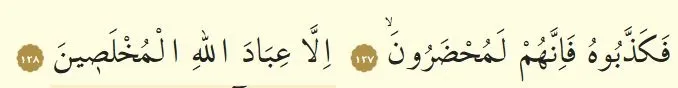 Saffat Suresi 127-128. Ayet anlamı şöyledir: Ama onu yalancılıkla suçladılar. Bu yüzden, Allah'ın samimi kulları dışında, onlar mutlaka cehenneme konulacaklar arasında olacaklar.